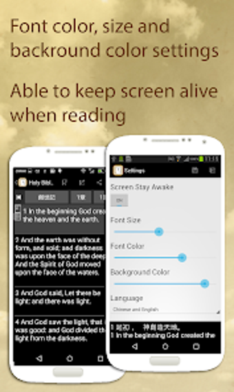 Chinese and English Bible - Free to aplikacja edukacyjna przeznaczona dla osób poszukujących dwujęzycznego dostępu do Pisma Świętego. Oferuje wersję Biblii w tradycyjnym chińskim języku (新標點和合本) oraz wersję angielską (King James Version - KJV). Użytkownicy mogą dostosować kolor i rozmiar czcionki, a także zmieniać kolor tła, co pozwala na spersonalizowane doświadczenie podczas czytania. Dodatkowo aplikacja umożliwia utrzymanie aktywnego ekranu podczas lektury, co jest wygodne dla dłuższego korzystania.
